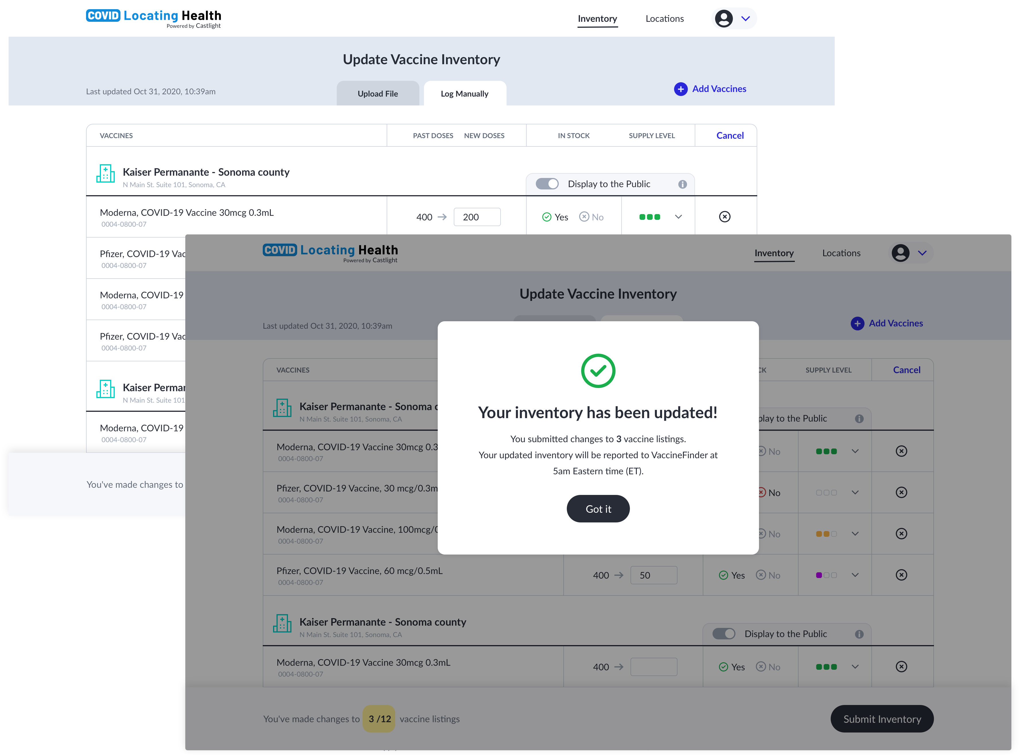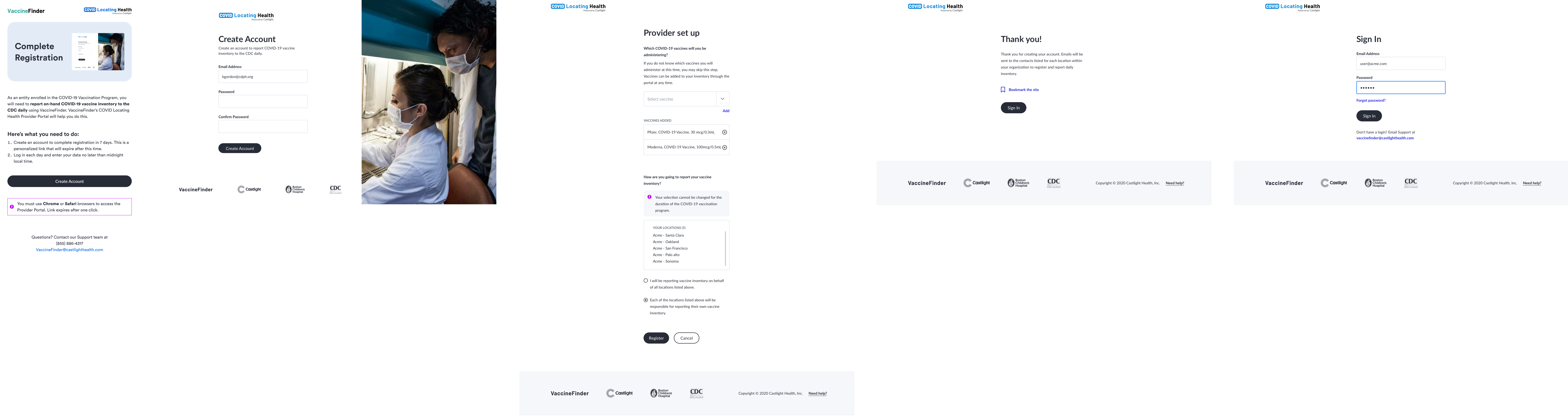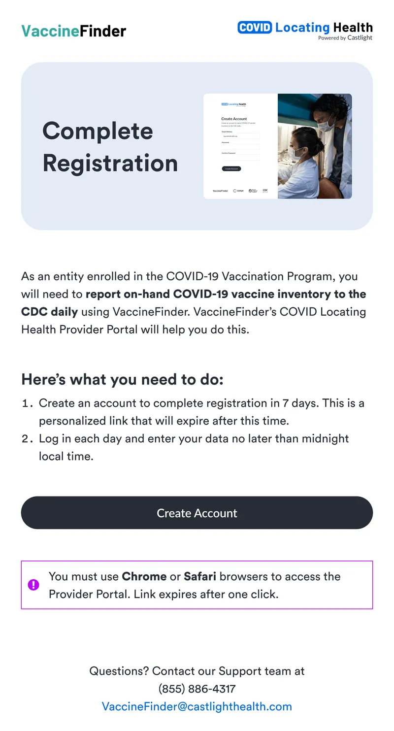 VaccineFinder.org and the Centers for Disease Control and Prevention required a nimble technology partner to support provider inventory management, analytics, and reporting. Leveraging Castlight Health's established COVID-19 efforts, this $15+ million initiative aimed to provide a tool for secure, simple, and dynamic system to intake provider inventory updates.
